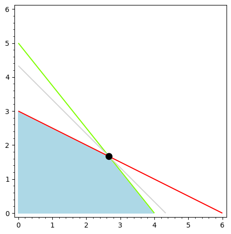 \[\begin{aligned} \max \ x + y \\[1ex] \text{p.p.} \quad x + 2y &\le 6 \\ 5x + 4y &\le 20 \\ x, y &\ge 0 \end{aligned}\]</span>
